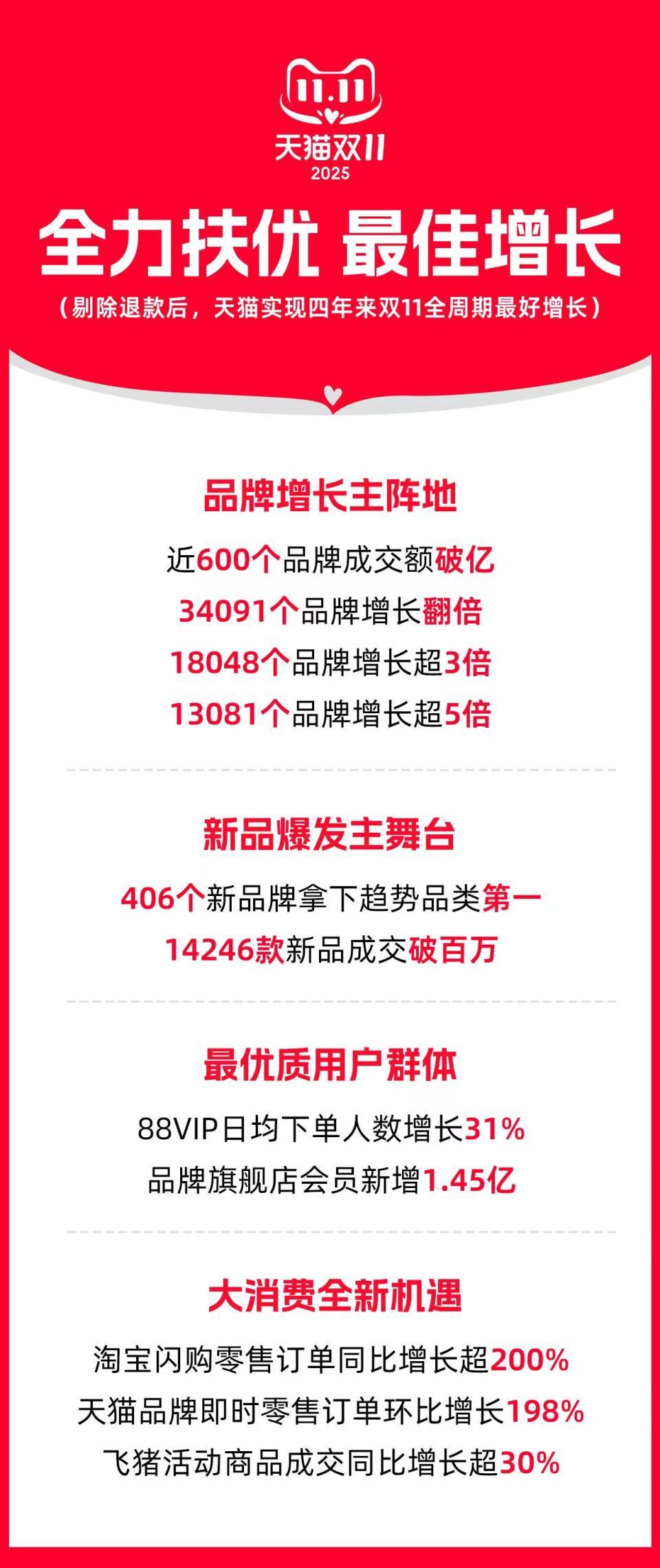 2025年天猫“双11”:剔除退款后成交新高 四年来全周期最好增长